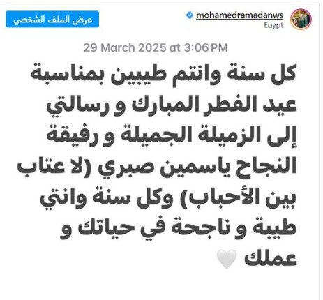 وقال محمد رمضان: "كل سنة وأنتم طيبين بمناسبة عيد الفطر المبارك ورسالتي إلى زميلتي الجميلة ورفيقة النجاح ياسمين صبري "لا عتاب بين الأحباب" وكل سنة وإنتي طيبة وناجحة في حياتك وعملك".