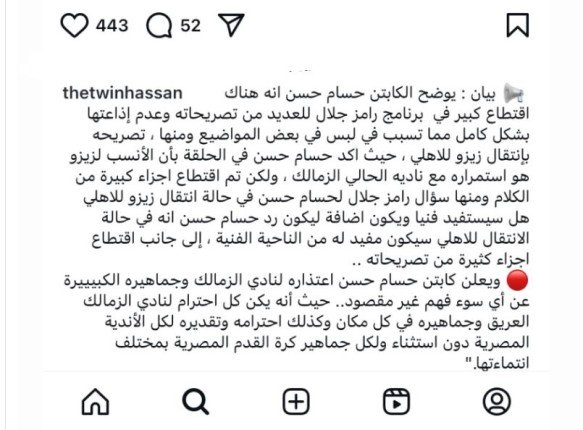 حيث جاء نص بيان بيان حسام حسن على النحو التالي: « يوضح الكابتن حسام حسن انه هناك اقتطاع كبير للعديد من تصريحاته وعدم إذاعتها بشكل كامل مما تسبب في لبث في بعض المواضيع ومنها، تصريحه بإنتقال زيزو للاهلي، حيث أكد حسام حسن في الحلقة بأن الأنسب لزيزو هو استمراره مع ناديه الحالي الزمالك، ولكن تم اقتطاع اجزاء كبيرة من الكلام ومنها سؤال في حالة انتقال زيزو للاهلي هل سيستفيد فنيا ويكون اضافة ليكون رد حسام حسن انه في حالة الانتقال للاهلي سيكون مفيد له من الناحية الفنية، إلى جانب اقتطاع اجزاء كثيرة من تصريحاته.