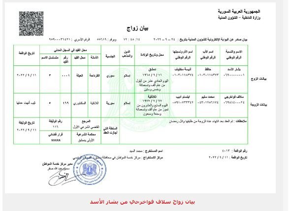 علقت النجمة السورية سلاف فواخرجي على الصورة المتداولة عبر مواقع التواصل الاجتماعي والتي تدعي وجود عقد زواج مزيف بينها وبين الرئيس السوري السابق بشار الأسد، وذلك بعدما قرر مجلس نقابة الفنانين السوريين شطبها، على خلفية إصرارها على إنكار جرائم نظام الأسد وتنكرها لآلام الشعب السوري، على وصف النقابة.