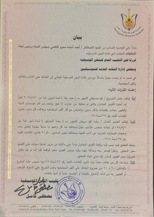ويأتي ذلك في ضوء ماتم رصده مؤخرا او اتساقا مع دور نقابة المهن الموسيقية الوطني في الحفاظ على الآداب والتقاليد المجتمعية.