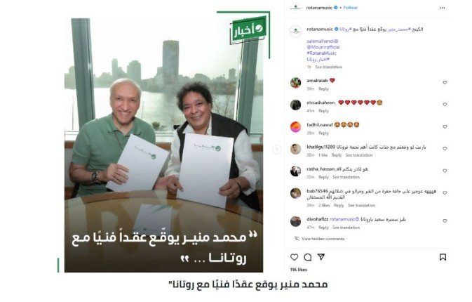 حيث نشرت روتانا عبر صفحتها الرسمية على موقع "إنستجرام" صورة من لحظة توقيع العقد، معلقة: "الملك محمد منير يوقّع عقدًا فنيًا مع روتانا."