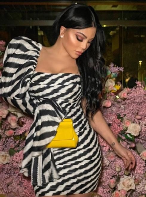 تألقت الفنانة هيفاء وهبي باطلالة جريئة مرتدية فستانا قصيرا ومُجسما باللونين الأبيض والأسود، أظهر جمالها، وتركت شعرها الأسود منسدلًا على ظهرها بطريقة انسيابية ناعمة، كما اعتمدت مكياج ترابي ناعم زاد من جمال إطلالتها.