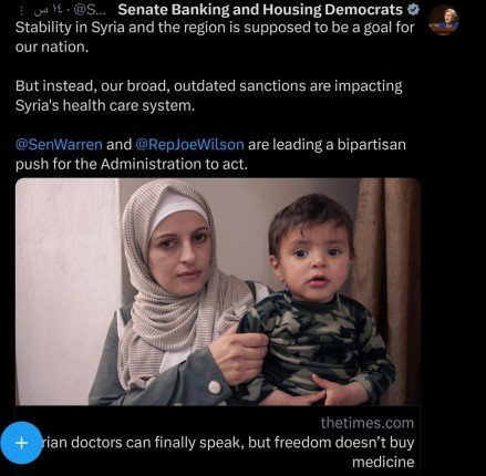 وكتبت وارن على منصة "إكس": "من المفترض أن يكون استقرار سوريا والمنطقة هدفًا لبلادنا، لكن العقوبات البالية تزيد الأوضاع سوءًا وتلحق أضرارًا مباشرة بنظام الرعاية الصحية هناك".