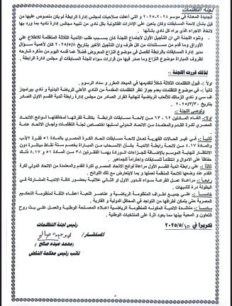 إلغاء المادتين 62 و63 من لائحة المسابقات بكافة فقراتهما، باعتبارهما تخالفان اللوائح المعتمدة من الاتحاد المصري لكرة القدم والمصدق عليها من الفيفا، مع التأكيد على اختصاص لجنة التظلمات واللجان القانونية بالاتحاد.