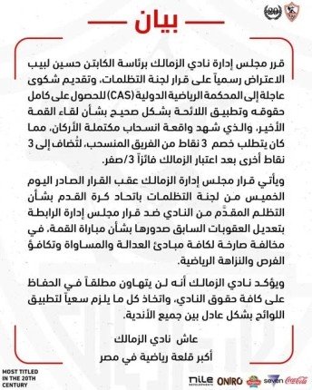 أعلن نادي الزمالك، برئاسة حسين لبيب، تقدمه بشكوى رسمية إلى المحكمة الرياضية الدولية (CAS)، اعتراضًا على قرار لجنة التظلمات بالاتحاد المصري لكرة القدم بشأن أزمة مباراة القمة الأخيرة أمام النادي الأهلي، والتي لم تُلعب بسبب انسحاب الفريق الأحمر.