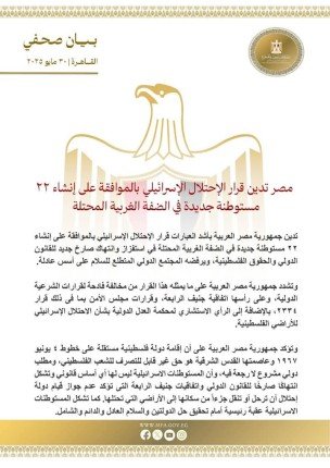 أعربت جمهورية مصر العربية عن إدانتها الشديدة لقرار سلطات الاحتلال الإسرائيلي الموافقة على إنشاء 22 مستوطنة جديدة في الضفة الغربية المحتلة، معتبرة ذلك انتهاكاً صارخاً للقانون الدولي وقرارات الشرعية الدولية.