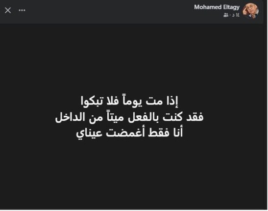 حيث كتب محمد التاجي، عبر حسابه الرسمي على «فيسبوك» قائلا: «إذا مت يومًا فلا تبكوا، فقد كنت بالفعل ميتًا من الداخل.. أنا فقط أغمضت عيني»، الأمر الذى زاد من مخاوف محبيه حول حالته الصحية.