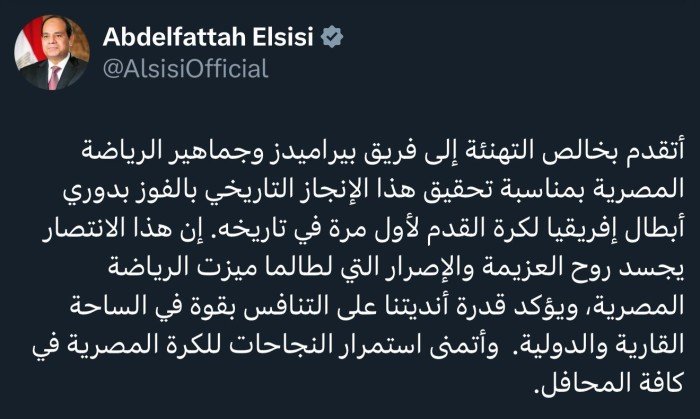 وكتب الرئيس السيسي على صفحته الرسمية بموقع فيسبوك: أتقدم بخالص التهنئة إلى فريق بيراميدز وجماهير الرياضة المصرية بمناسبة تحقيق هذا الإنجاز التاريخي بالفوز بدوري أبطال إفريقيا لكرة القدم لأول مرة في تاريخه. إن هذا الانتصار يجسد روح العزيمة والإصرار التي لطالما ميزت الرياضة المصرية، ويؤكد قدرة أنديتنا على التنافس بقوة في الساحة القارية والدولية. وأتمنى استمرار النجاحات للكرة المصرية في كافة المحافل.