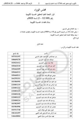 صدر اليوم الأربعاء ملحق الجريدة الرسمية «الكويت اليوم»، وتضمّن قرار اللجنة العليا لتحقيق الجنسية الكويتية رقم (105 / 12 - 2) لسنة 2025