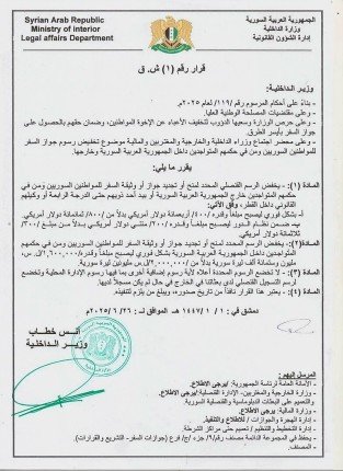 تم تخفيض رسوم الحصول على جواز السفر بشكل فوري من مليوني ليرة سورية إلى مليون و600 ألف ليرة سورية.