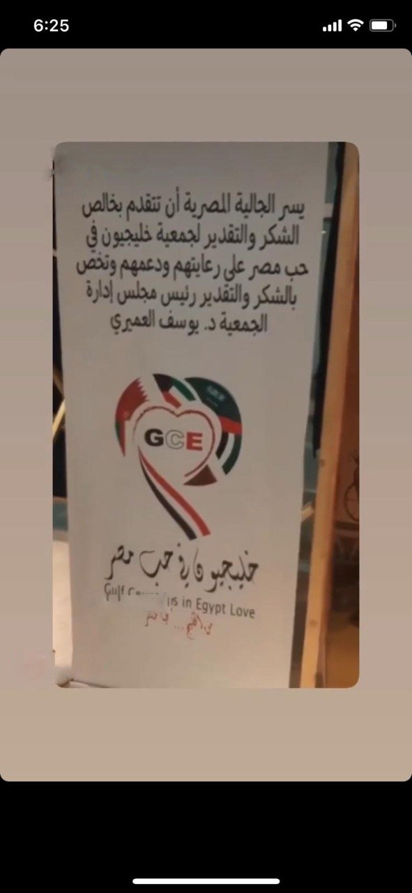 وحرصا من طلاب مصر بجامعة الكويت على تثمين جهود جمعية خليجيون في حب مصر، تم وضع لافتة كبرى تحمل رسالة شكر إلى الجمعية، حيث وجه الطلاب رسالة قائلين:« يسر الجالية المصرية أن تتقدم بخالص الشكر والتقدير لجمعية خليجيون في حب مصر على رعايتهم ودعمهم، وتخص بالشكر الدكتور يوسف العميري، رئيس مجلس إدارة الجمعية».