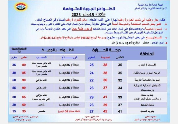 أعلنت الهيئة العامة للأرصاد الجوية بمصر، أن البلاد تشهد اليوم الثلاثاء 15 يوليو 2025 طقسًا حارًا رطبًا إلى شديد الحرارة نهارًا على معظم أنحاء الجمهورية، بينما يكون مائلًا للحرارة ليلًا ومائلًا للبرودة في الصباح الباكر.