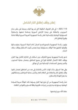 عاجل| الرئاسة السورية تعلن وقفًا شاملًا وفوريًا لإطلاق النار في السويداء