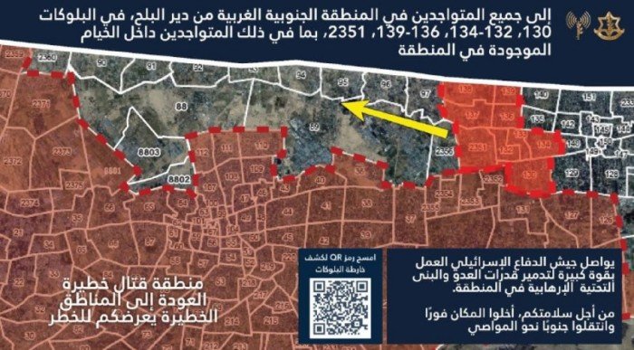 أصدر الجيش الإسرائيلي، صباح الأحد، تعليمات جديدة بإخلاء مناطق واسعة من جنوب غرب مدينة دير البلح في قطاع غزة، شملت عددا من أحياء الخيام والمربعات السكنية، محذرا السكان من البقاء في المنطقة.
