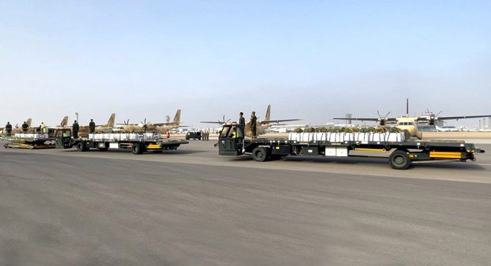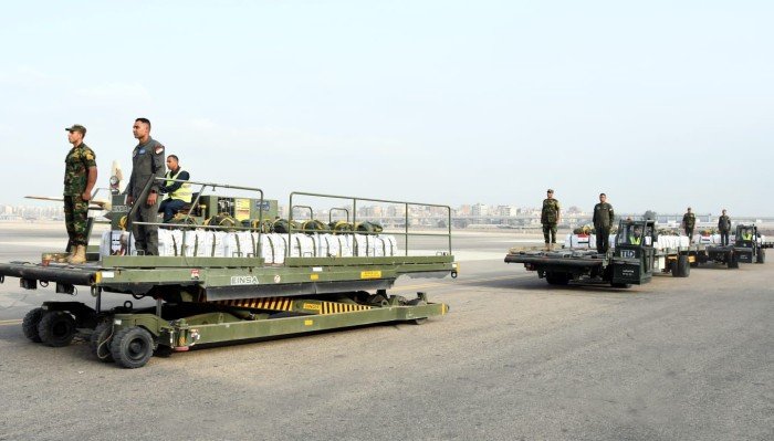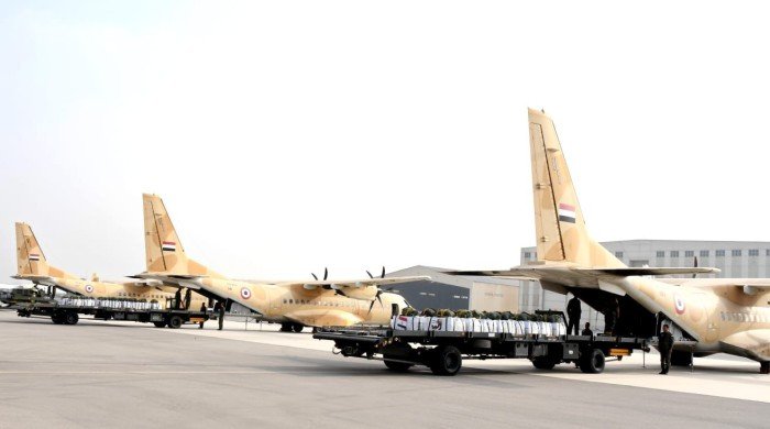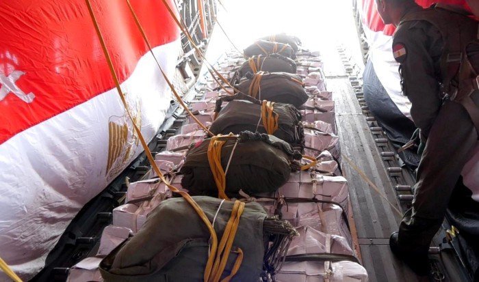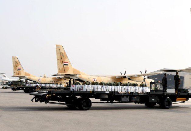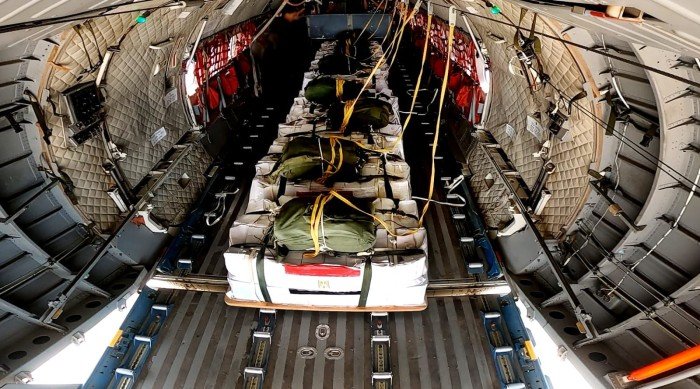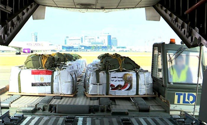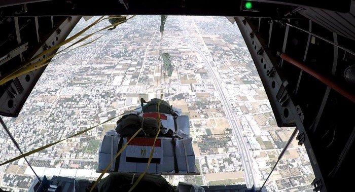 تنفيذاً لتوجيهات السيد الرئيس عبد الفتاح السيسي رئيس الجمهورية القائد الأعلى للقوات المسلحة بتقديم أوجه الدعم للأشقاء الفلسطينيين لتجاوز محنتهم الراهنة، وفي إطار الجهود المصرية الفاعلة والمساعي المكثفة بالتنسيق مع جميع الأطراف والقوى الدولية لمحاولة إنهاء تفاقم الأوضاع المأساوية التى يعانى منها الأشقاء الفلسطينين بقطاع غزة خلال الآونة الأخيرة.. أقلعت 4 طائرات نقل عسكرية من جمهورية مصر العربية محملة بأطنان من المساعدات الغذائية، لتنفيذ أعمال الإسقاط الجوي على المناطق التي يصعب الوصول إليها براً بقطاع غزة.