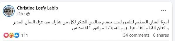 وكتبت ابنة الفنان الراحل في بيان عبر حسابها على "فيس بوك": "أسرة الفنان العظيم لطفي لبيب تتقدم بخالص الشكر لكل من شارك في عزاء الفنان القدير، وتعلن أنه تم إلغاء عزاء يوم السبت الموافق 2 أغسطس".