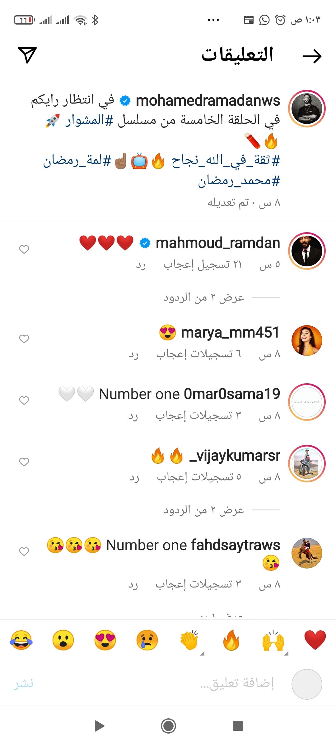 ونشر رمضان عدة صور من حلقات المسلسل، وذلك عبر حسابه الشخصي بموقع التواصل الاجتماعي «انستغرام»، معلقاً:«في انتظار رأيكم في الحلقة الخامسة من مسلسل المشوار».