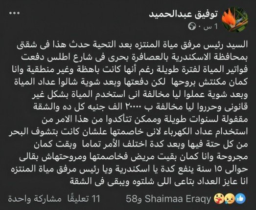 وأضاف توفيق عبد الحميد: "يمكنكم التحقق من هذا الأمر من خلال عداد الكهرباء، لأنني خصمت الشقة عن الاستخدام الشخصي لأنها كانت تطل على البحر من كل جانب، وبعد ذلك تغير الوضع تمامًا وأصبحت متضررة، وأنا أيضًا مرضت، لذا لم أعد أزورها منذ نحو 15 سنة. هل هذا مقبول يا محافظة الإسكندرية ويا رئيس مرفق مياه المنتزه؟ أريد عودة العداد الذي أزيل وألا يكون هناك أي ضرر في الشقة".