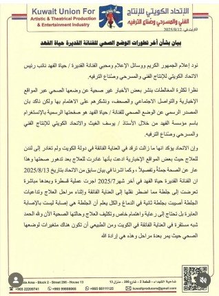 وفي ختام البيان، تم نفي الشائعات التي تداولت مؤخرًا حول دخول الفنانة في غيبوبة تامة، حيث أكدت المصادر الطبية ونقابة الفنانين الكويتيين بالتنسيق مع مكتب الفنانة، أن هذه الأخبار غير دقيقة ولا أساس لها من الصحة.