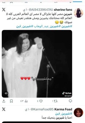 واشتعل موقع "إكس" (تويتر سابقًا) خلال الساعات الماضية بهاشتاغَيْن: "#فين_شيرين" و"#شيرين_فين"، بعد أن دشنهما محبو الفنانة للتساؤل عن سبب غيابها، وللتعبير عن اشتياقهم لصوتها وظهورها الفني، وسط حالةٍ من القلق الواضح بين جمهورها. وجاء ذلك بعد تداول أنباء خلال الفترة الماضية تشير إلى أنها تتواجد حاليًّا في سويسرا للعلاج النفسي.