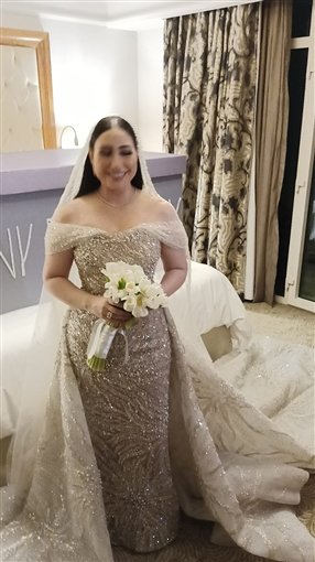 حيث ارتدت بوسي فستان زفاف كالأميرات من تصميم العالمي هاني البحيري ومن المقرر أن ينضم لها العريس بعد قليل لبدء مراسم الزفاف.