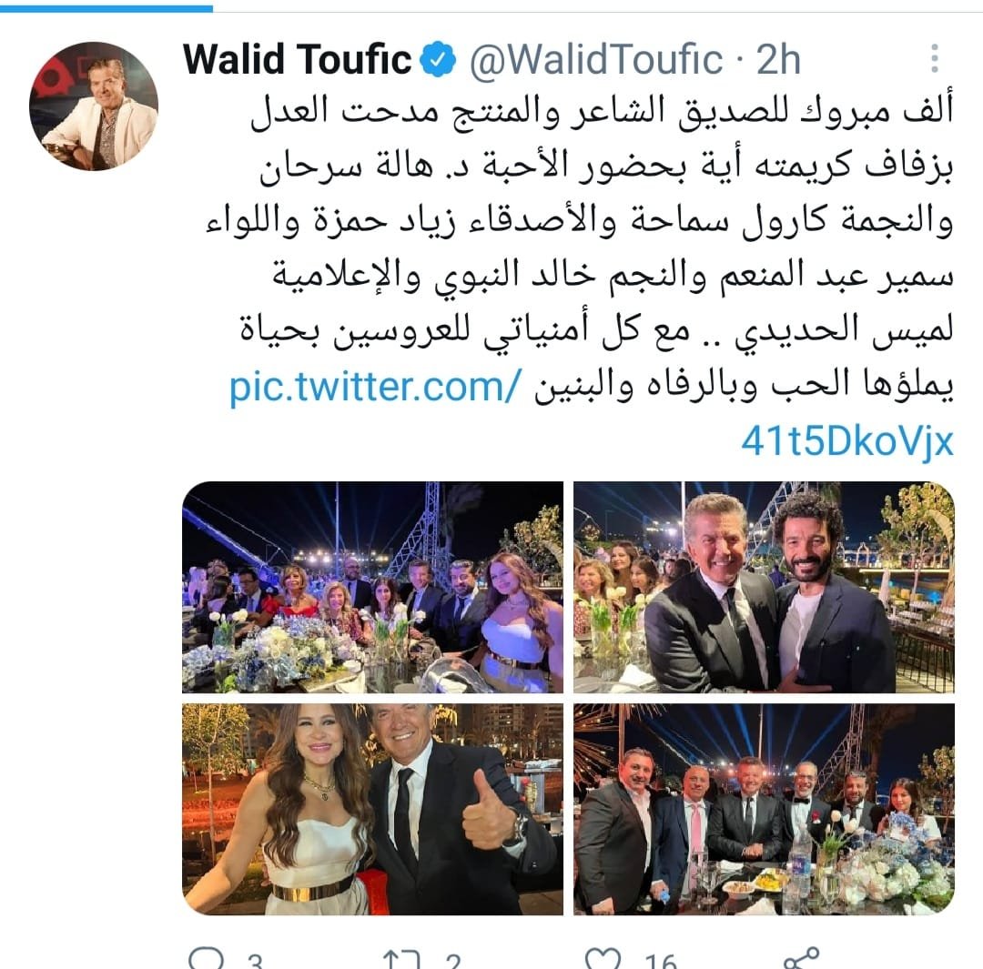 وكتب وليد تعليقا على الصور عبر حسابه الرسمي على موقع التغريدات "تويتر":" ألف مبروك للصديق الشاعر والمنتج مدحت العدل بزفاف كريمته أية بحضور الأحبة د.هالة سرحان والنجمة كارول سماحة والأصدقاء زياد حمزة واللواء سمير عبد المنعم والنجم خالد النبوي والإعلامية لميس الحديدي.. مع كل أمنياتي للعروسين بحياة يملؤها الحب وبالرفاه والبنين".