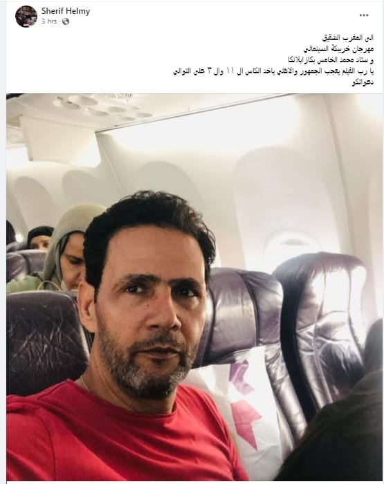 وقال شريف حلمى عبر حسابه على موقع التواصل الاجتماعي الفيس بوك: «إلى المغرب الشقيق.. مهرجان خريبكة السينمائي وستاد محمد الخامس بكازابلانكا.. يا رب الفيلم يعجب الجمهور والأهلي يأخد الكأس الـ11 والـ3 على التوالي دعواتكم».