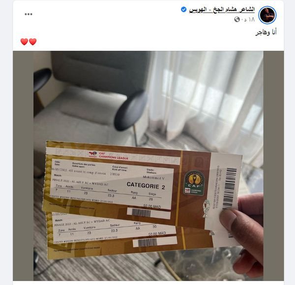 ويحضر المباراة أيضا الشاعر هشام الجخ وابنته حيث نشر على حسابه الشخصي على موقع التواصل الاجتماعي فيس بوك، صورة تحتوي على تذكرتين للمباراة بين الأهلي والوداد، وعلق عليها قائلا:"انا وهاجر" في إشارة الى ابنته التي تحضر معه المباراة.