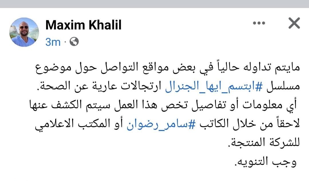 تداول رواد مواقع التواصل الاجتماعي أنباء عن تعاقد الفنان مكسيم خليل على مسلسل جديد بعنوان "ابتسم أيها الجنرال"، وذهبت بعض التكهنات حول قصة العمل أنه سيتناول فترة الفساد في سوريا خلال فترة التسعينات.