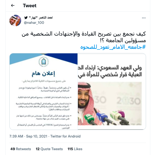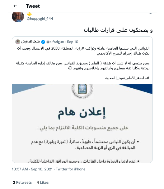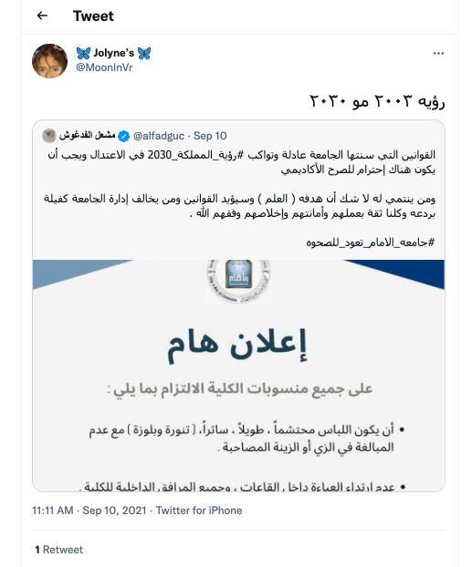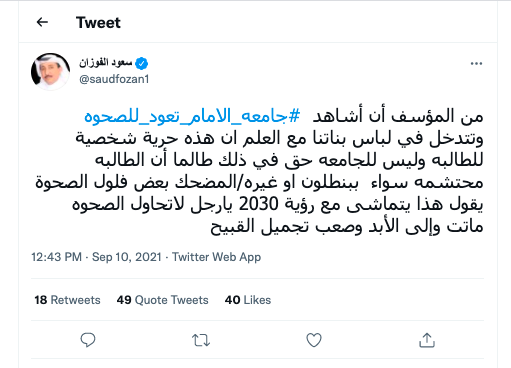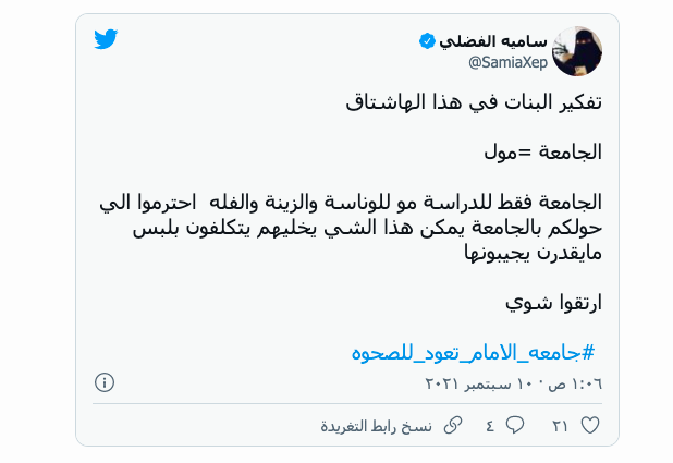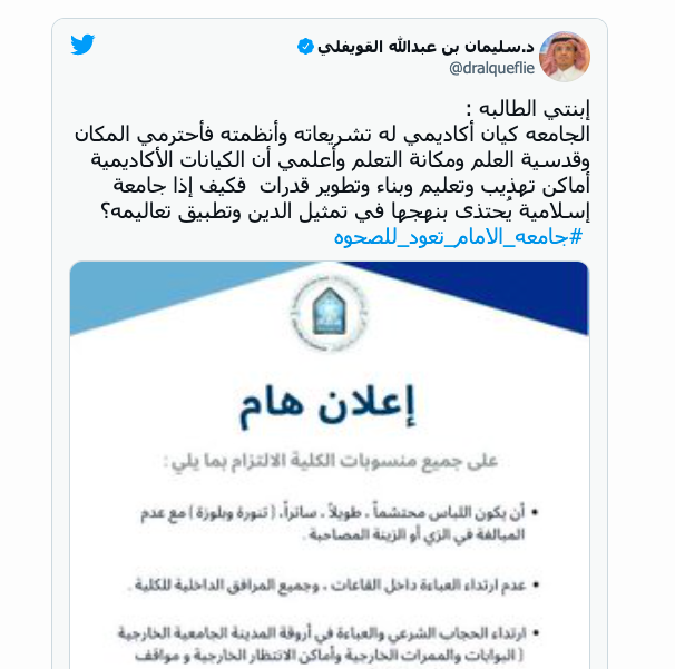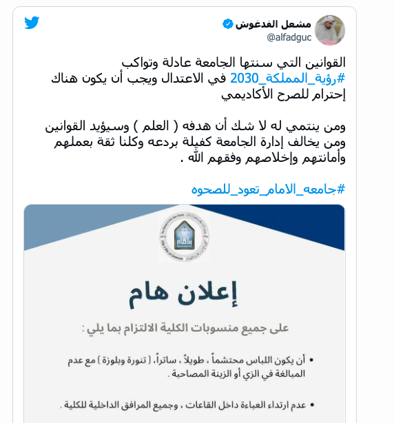 أثار إعلان خاص بضوابط زي الطالبات في جامعة الإمام محمد بن سعود الإسلامية في السعودية جدلاً واسعاً عبر مواقع التواصل الاجتماعي في المملكة.