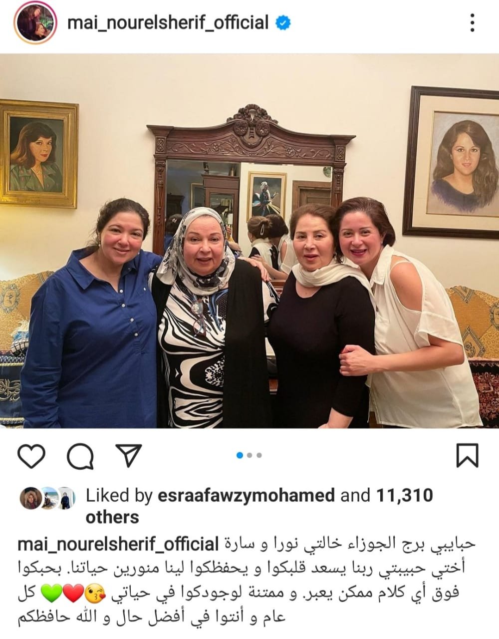وكتبت مي عبر "انستجرام":"حبايبي برج الجوزاء خالتي نورا وسارة أختي حبيبتي ربنا يسعد قلبكوا ويحفظكوا لينا منورين حياتنا".
