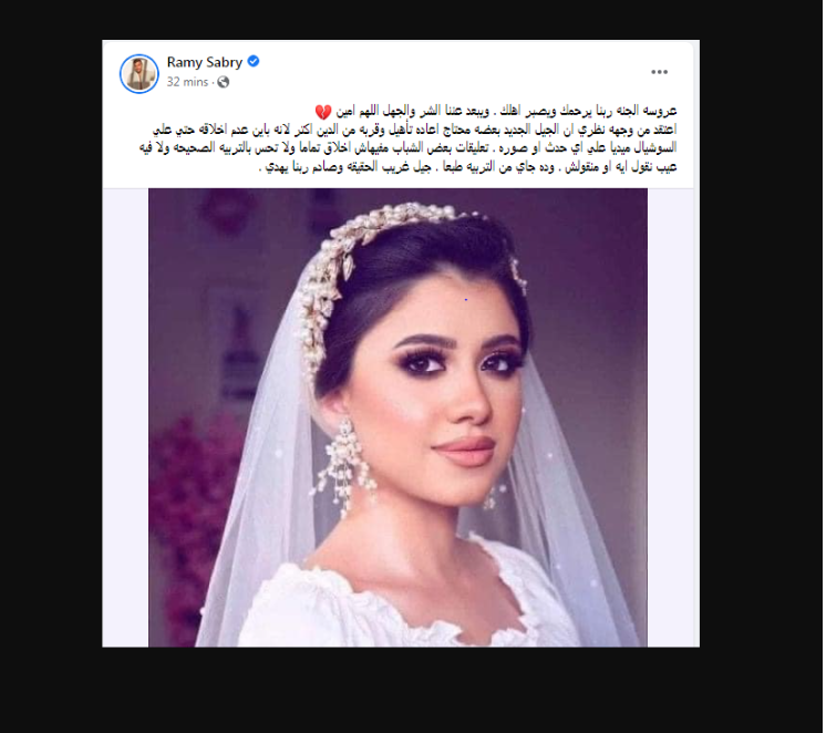 حيث قام نشر رامى صبرى صورة لفتاة المنصورة وهى ترتدى فستان زفاف عبر حسابه الرسمى بموقع فيسبوك وعلق: "عروسة الجنة ربنا يرحمك ويصبر أهلك.. ويبعد عننا الشر والجهل اللهم أمين".