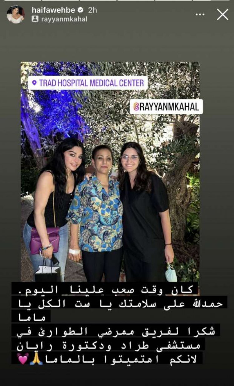 ونشرت هيفاء صورة برفقة والدتها وعلقت عليها قائلة: "كان وقت صعب علينا اليوم، حمدا لله على سلامتك يا ست الكل يا ماما، شكرا لفريق ممرضي الطوارئ في مستشفي طراد ودكتورة ريان لأنكم اهتميتوا بالماما".