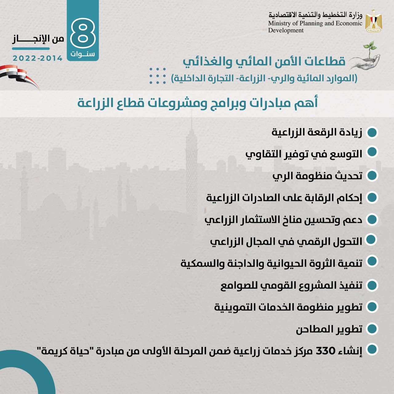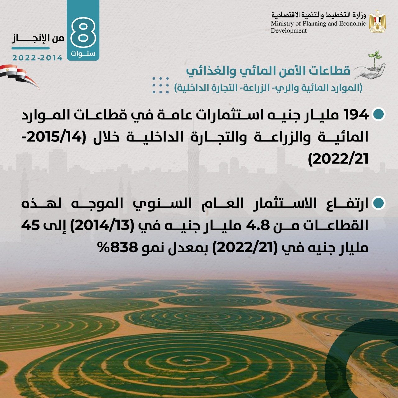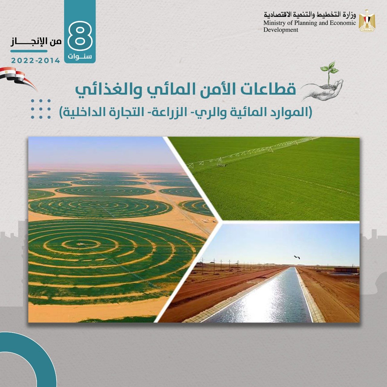 أصدرت وزارة التخطيط والتنمية الاقتصادية تقريرًا تستعرض فيه جهود الدولة لتحقيق الأمن المائي والغذائي في قطاع الموارد المائية والري خلال 8 سنوات (من يوليو 2014 إلى يونيو 2022).