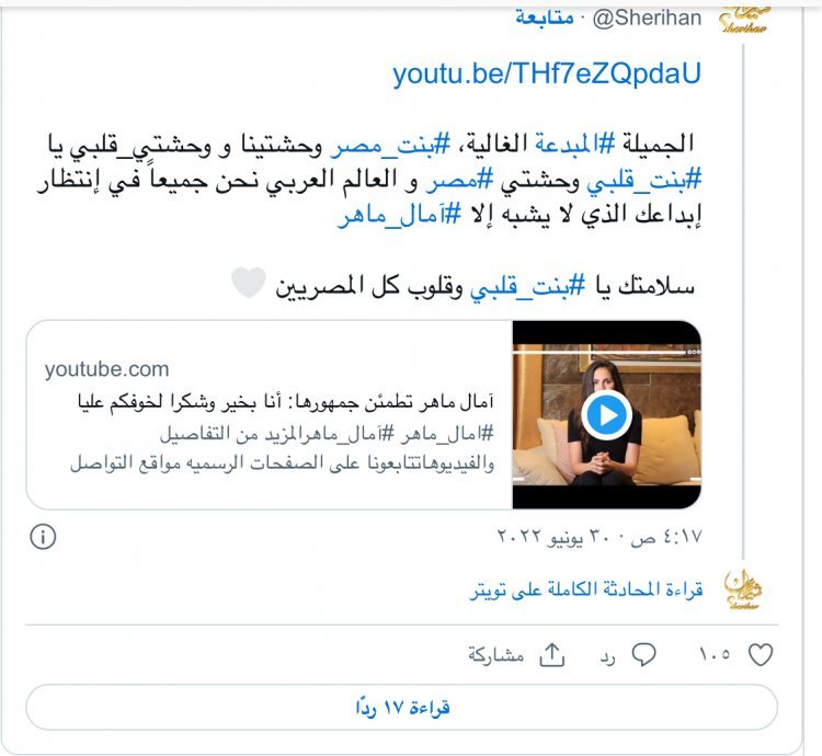 وكتبت شريهان عبر حسابها بموقع التغريدات "تويتر": "الجميلة المبدعة الغالية، بنت مصر وحشتينا ووحشتي قلبي يا بنت قلبي وحشتي مصر والعالم العربي نحن جميعاً في انتظار إبداعك الذي لا يشبه إلا #آمال_ماهر.. سلامتك يا بنت قلبي وقلوب كل المصريين".