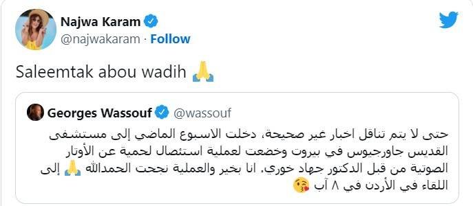 تمنت الفنانة اللبنانية نجوى كرم، الشفاء العاجل للفنان جورج وسوف، بعد خضوعه لعملية جراحية ناجحة لإزالة لحمية من على الأوتار الصوتية.