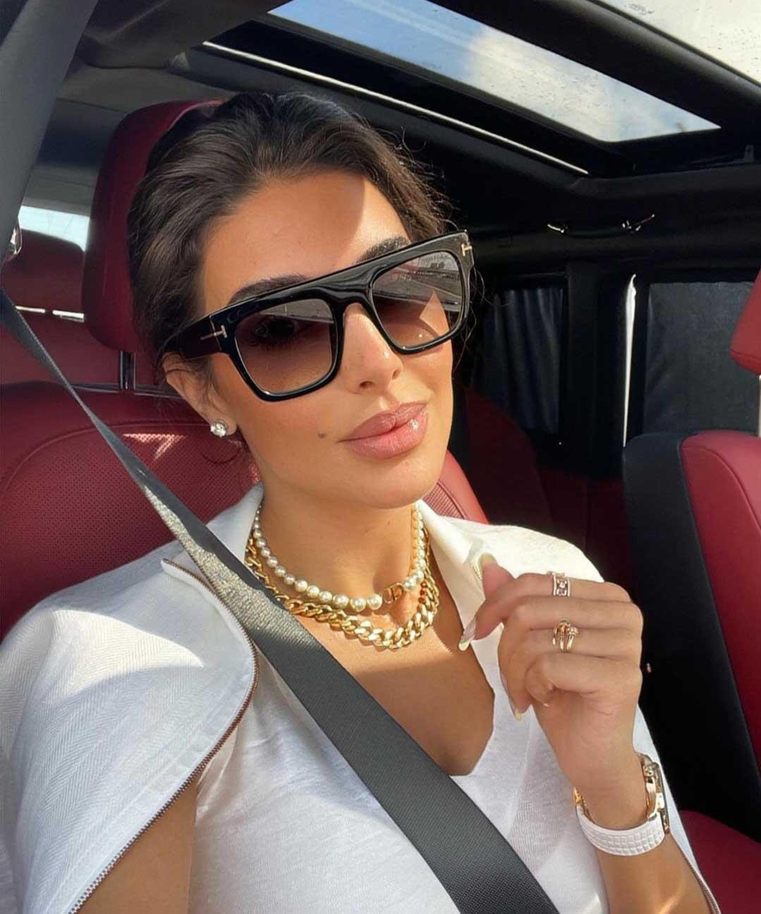 وزينت إطلالتها بارتدائها إكسسوارات مكونة من كوليه، وحلق، وعدة خواتم، إضافة إلى ساعة يد، ونظارة شمسية.