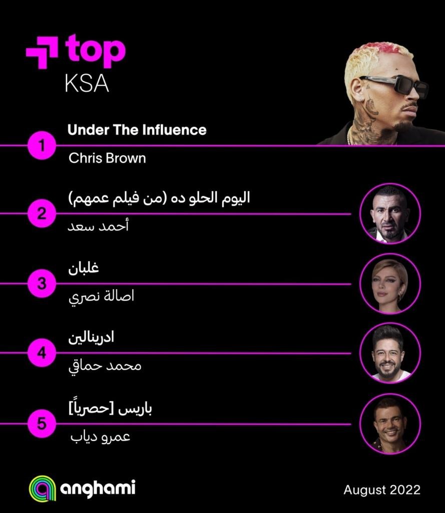 فى السعودية جاءت أغنية ( Under The Influence ) المركز الأول للاستماعات، وجاءت أغنية ( اليوم الحلو ده ) لأحمد سعد فى المركز الثانى. فيما احتلت أغنية ( غلبان ) لأصالة نصرى المركز الثالث.