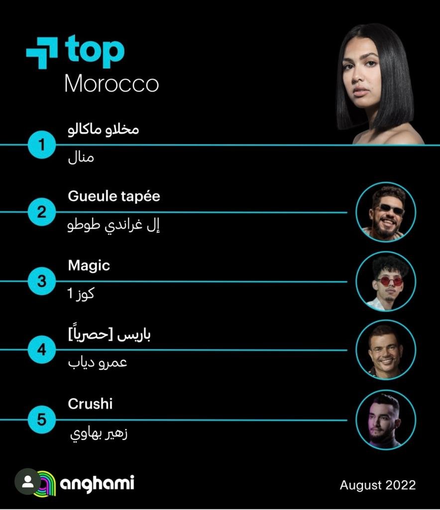 أما فى المغرب فقد تصدرت قوائم الاستماع أغنية منال ( مخلاو ماكالو ) المركز الأول للاستماعات، وفى تونس تصدرت الاستماعات أغنية علاء ( IDK )، وفى المركز الثاني جاءت أغنية ( Maktoub ) للمطرب علاء أيضا، أما فى الجزائر فقد احتلت أغنية ( Mazalni ) للمطرب جليل باليرمو المركز الاول فى الاستماعات.