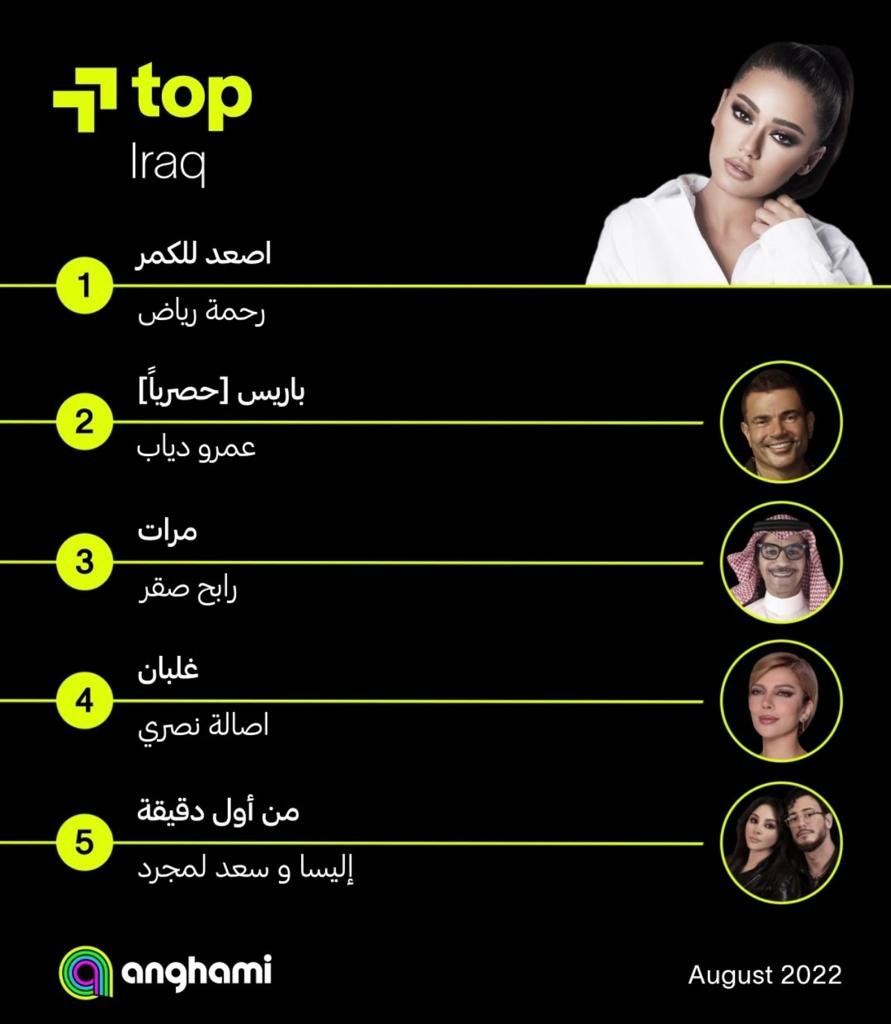 إلى العراق حيث تصدرت رحمة رياض بأغنية من ( اصعد للكمر ) المركز الأول فالاستماعات، فيما احتلت أغنية ( باريس ) للهضبة عمرو دياب المركز الثاني.. وجاءت اغنية ( مرات ) لرابح صقر المركز الثالث.
