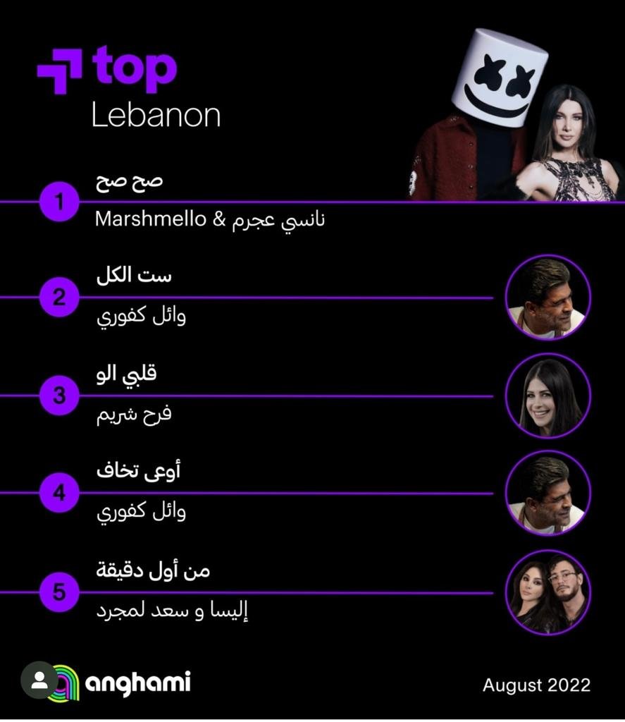 بالانتقال إلى لبنان، تصدرت نانسي عجرم و Marshmello قوائم الاستماع بأغنية ( صح صح ) فى المركز الأول، وجاءت اغنية وائل كفوري ( ست الكل ) فى المركز الثاني.. فيما احتلت اغنيه ( قلبي الو ) لفرح شريم المركز الثالث.