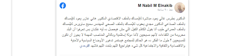 من جانبه علّق المحامي نبيل النقيب على براءة وزير المالية الأسبق يوسف بطرس غالي، من تهمة الإضرار العمدي بالمال العام. وكتب النقيب عبر حسابه الرسمي على فيسبوك:" الدكتور بطرس غالي يعود مباشرة للإمساك بالملف الاقتصادي الدكتور هاني عازر يعود للإمساك بالملف الصناعي الدكتور مجدي يعقوب للإمساك بالملف الصحي المهندس سميح ساويرس للإمساك بالملف العمراني. مضيفا:" طيب أنا بقول الكلام الثقيل اللي مش هيحصل ده ليه علشان بس تعرفوا أن البلد محرومة من الكفاءات لأنهم مسيحيين لأننا دولة إسلامية وبالتالي المناصب المهمة لا يجوز أن تكون للمسيحيين؟ طول ما الفكر ده هو الحاكم للمجتمع هيستمر تدهور الأوضاع السياسية والأمنية والاقتصادية والثقافية والاجتماعية كل شيء هيتراجع! اللهم بلغت اللهم فاشهد.