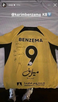 ونشر "فينيسيوس" عبر حسابه على "إنستجرام" صورة لهدية من بنزيما وهي عبارة عن قميص وقع عليه النجم الفرنسي ما أثار موجة من التكهنات حول علاقة الهدية مع ارتباط اسم فيني بالرحيل إلى الدوري السعودي.